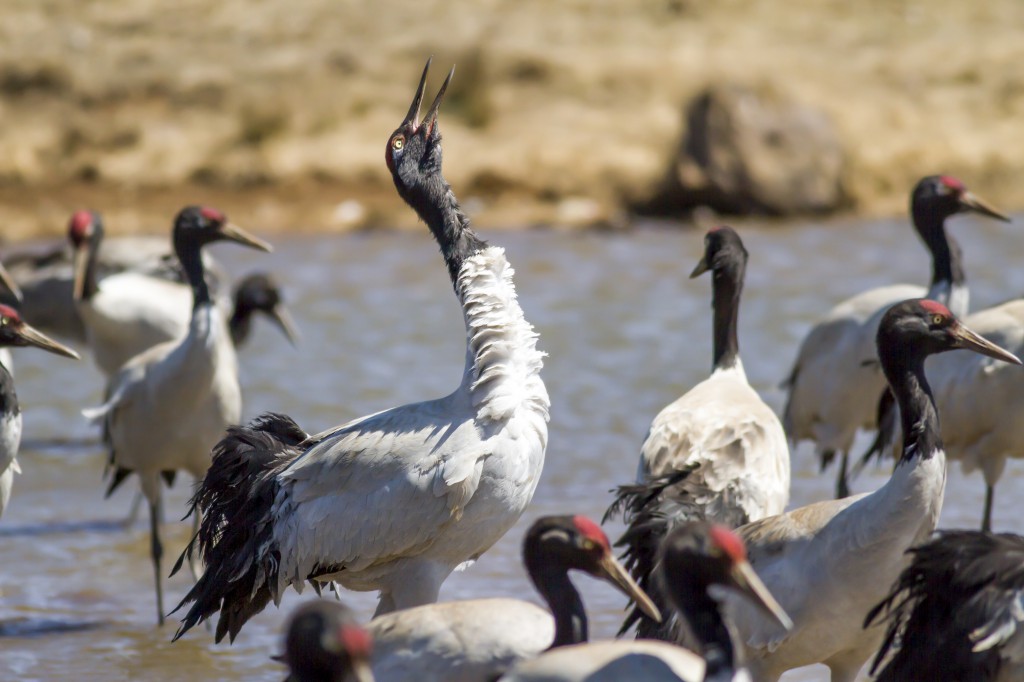 黑颈鹤为大型涉禽,藏语音译为“宗宗”,是西藏人心目中的神鸟。成年黑颈鹤体重有5-7公斤,昂首向天时,几与人齐高。每年春暖花开时,从藏南和其他越冬地飞到藏北的湿地沼泽水域,完成下蛋、孵化、哺育幼儿等生命过程。活动地点的海拔在3500-5000米,一般数十只成群,也有一对、一家单独生活。面对游人偷窥,它们会发出“果果”的叫声,扇动翅膀,摆动头颈和身体,做出舞蹈动作来迷惑人;实际上,它们的脚下在移动,不知不觉中,与人的距离已加大了。有人认为,它们常爱炫耀舞姿,以优美的舞姿为迷幻剂,是为了显示自身的强大,并达到自身的安全撤退。